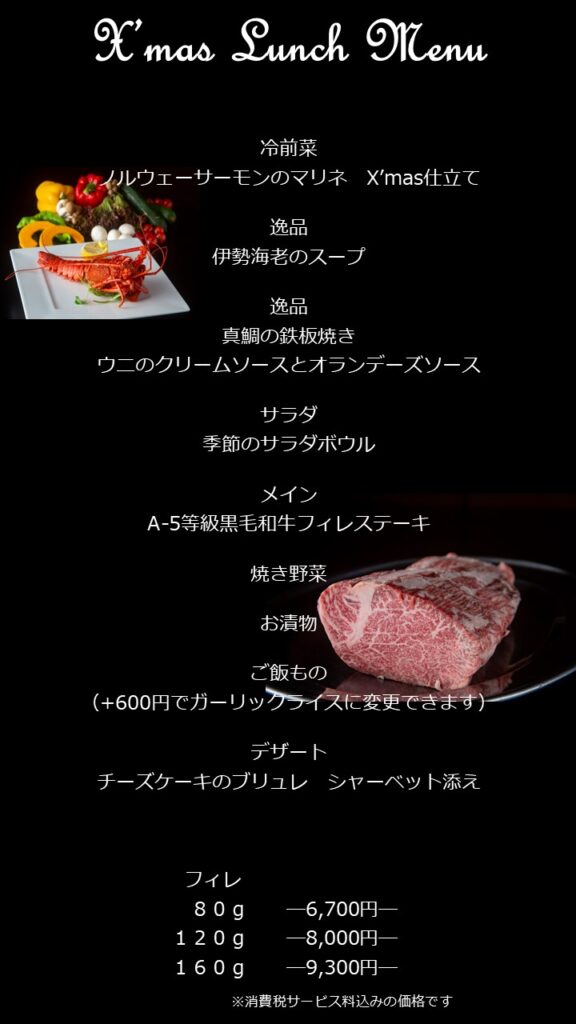 12/23・24・25の3日間、ランチとディナー共にクリスマス特別コースを販売いたします。